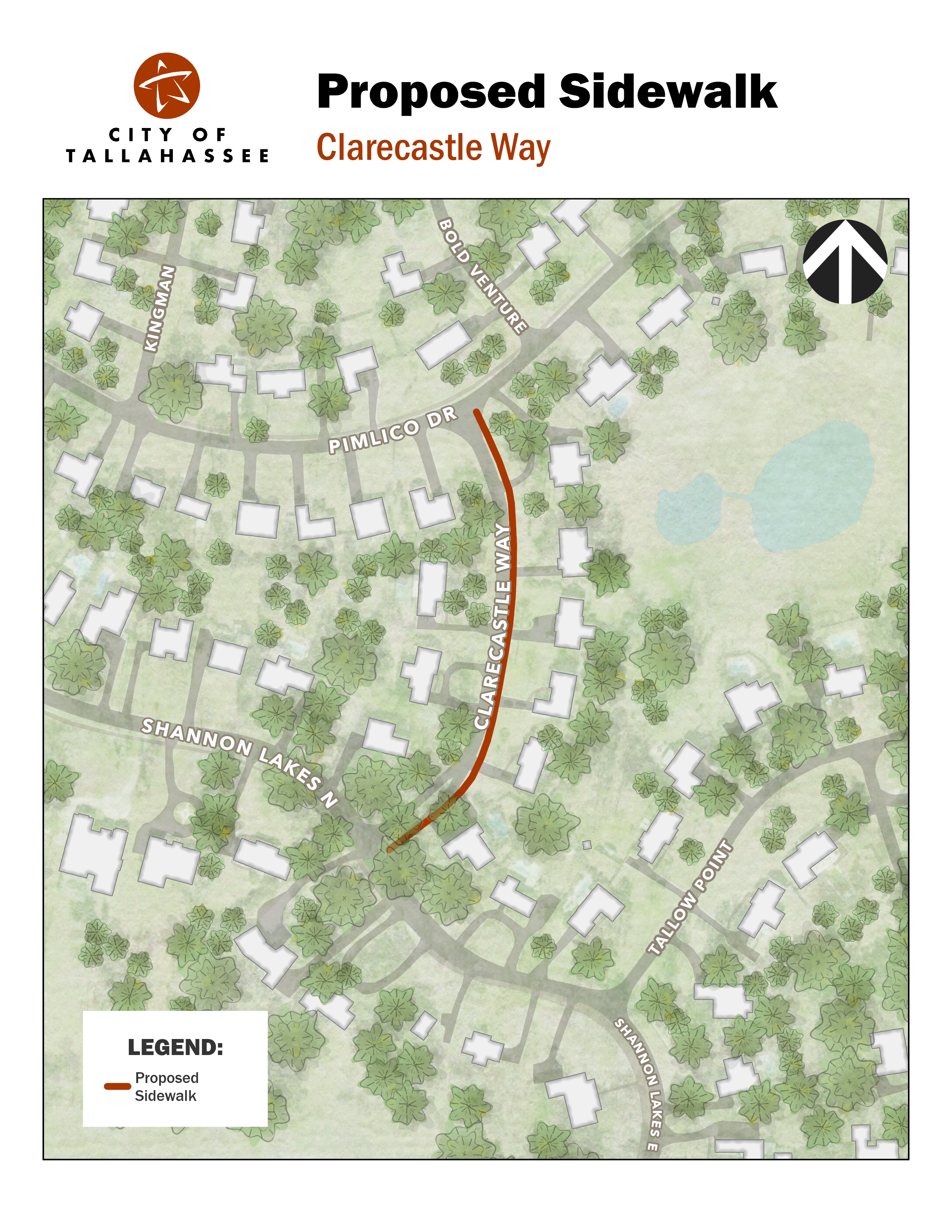To enhance safety and mobility options in the area, the City of Tallahassee is in the design stage for sidewalk improvements along Clarecastle Way from Shannon Lakes Drive North to Pimlico Drive.